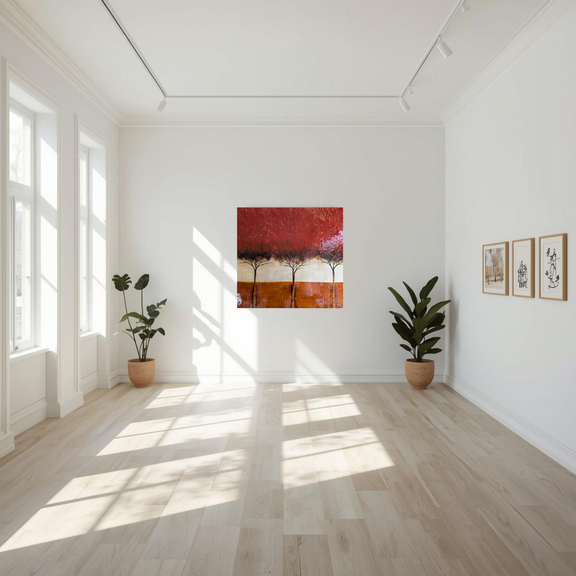 Featuring stylised red-crowned trees set within an abstract landscape, the artwork is created in acrylic or mixed media on canvas and finished with a high-gloss resin or varnish for a luminous, metallic effect. With its bold hues and reflective finish, this striking piece fills your wall with warmth, depth, and effortless beauty.