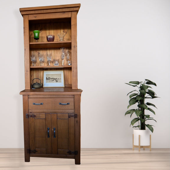 The dresser comes in two separate sections (top display unit and lower cupboard), allowing for easier transport and flexible placement. The upper section features open shelving ideal for displaying crockery, glassware or decorative pieces while the lower section offers a generous drawer and double cupboard for concealed storage.