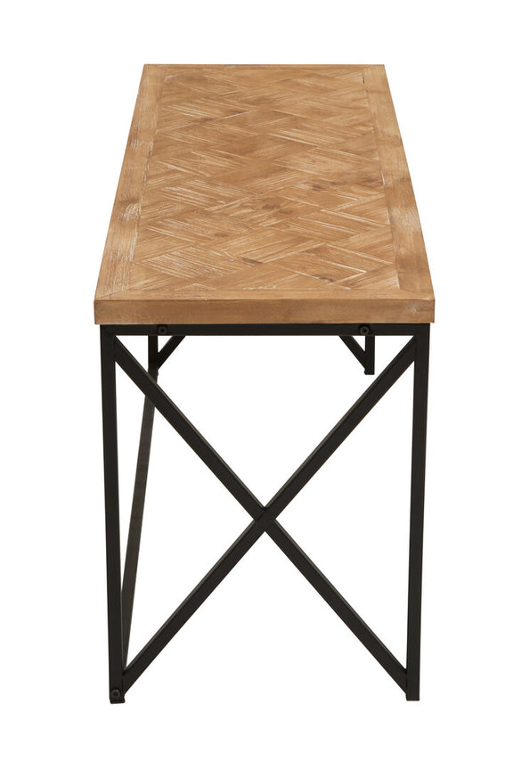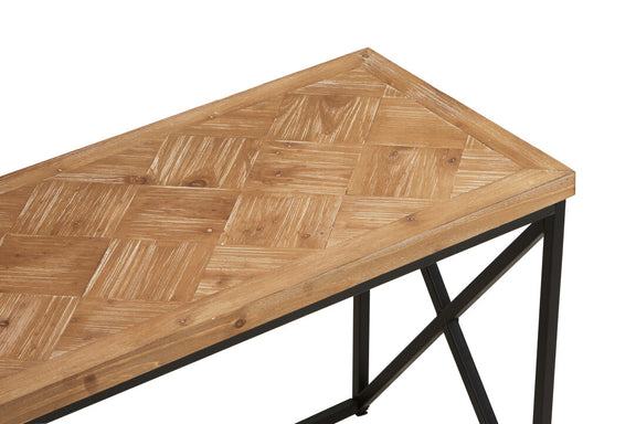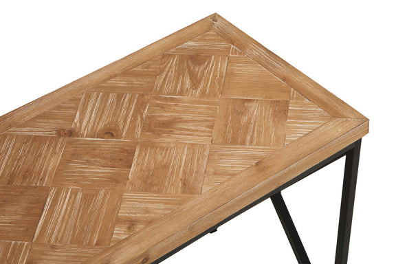 This stylish coffee table combines a parquet fir wood top with a geometric black iron frame, offering a modern industrial aesthetic.