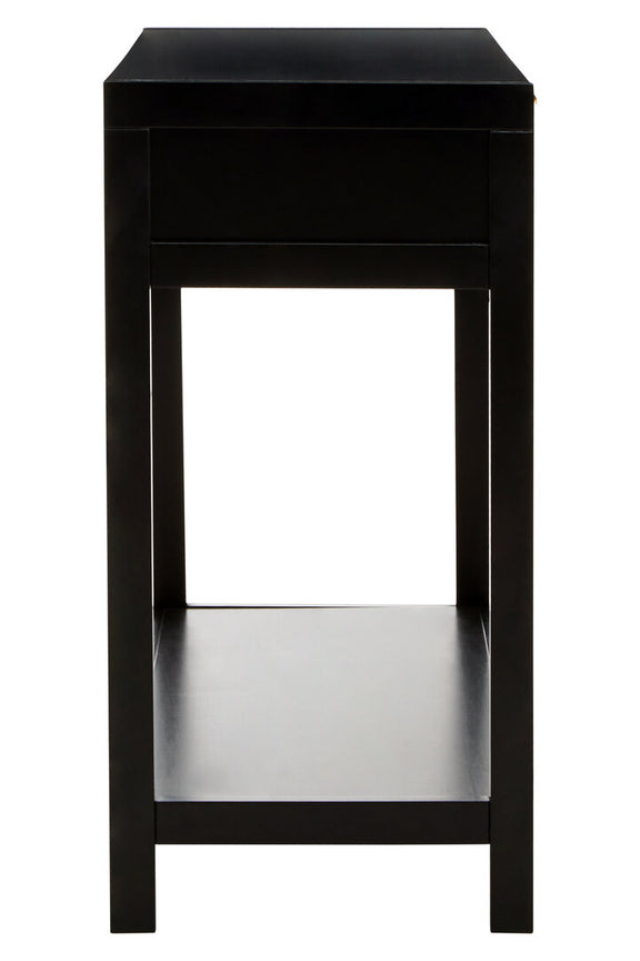 This console table is crafted from wood with a black paint finish. The natural rattan panels on the front of the drawers give the table a warm and earthy aesthetic. The table comes with an undershelf for additional storage.