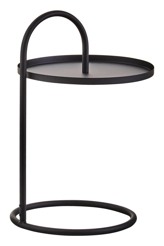 This side table has a sleek and minimalist black iron frame which gently curves to hang the rounded black iron top which features raised sides. The round base adds stability and further elevates the modern look.